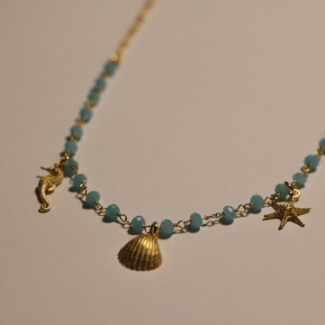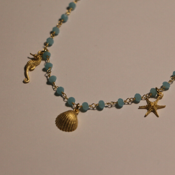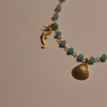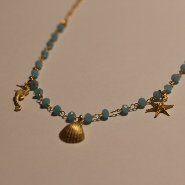 Colar em prata 925 dourada com pedras azuis amarradas e motivos marinhos em prata dourada.