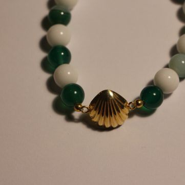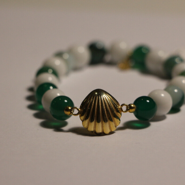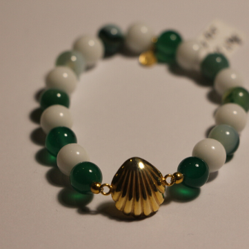 Pulseira em prata 925 dourada e pedras verdes e Jades brancas tem ao centro uma concha em prata dourada.